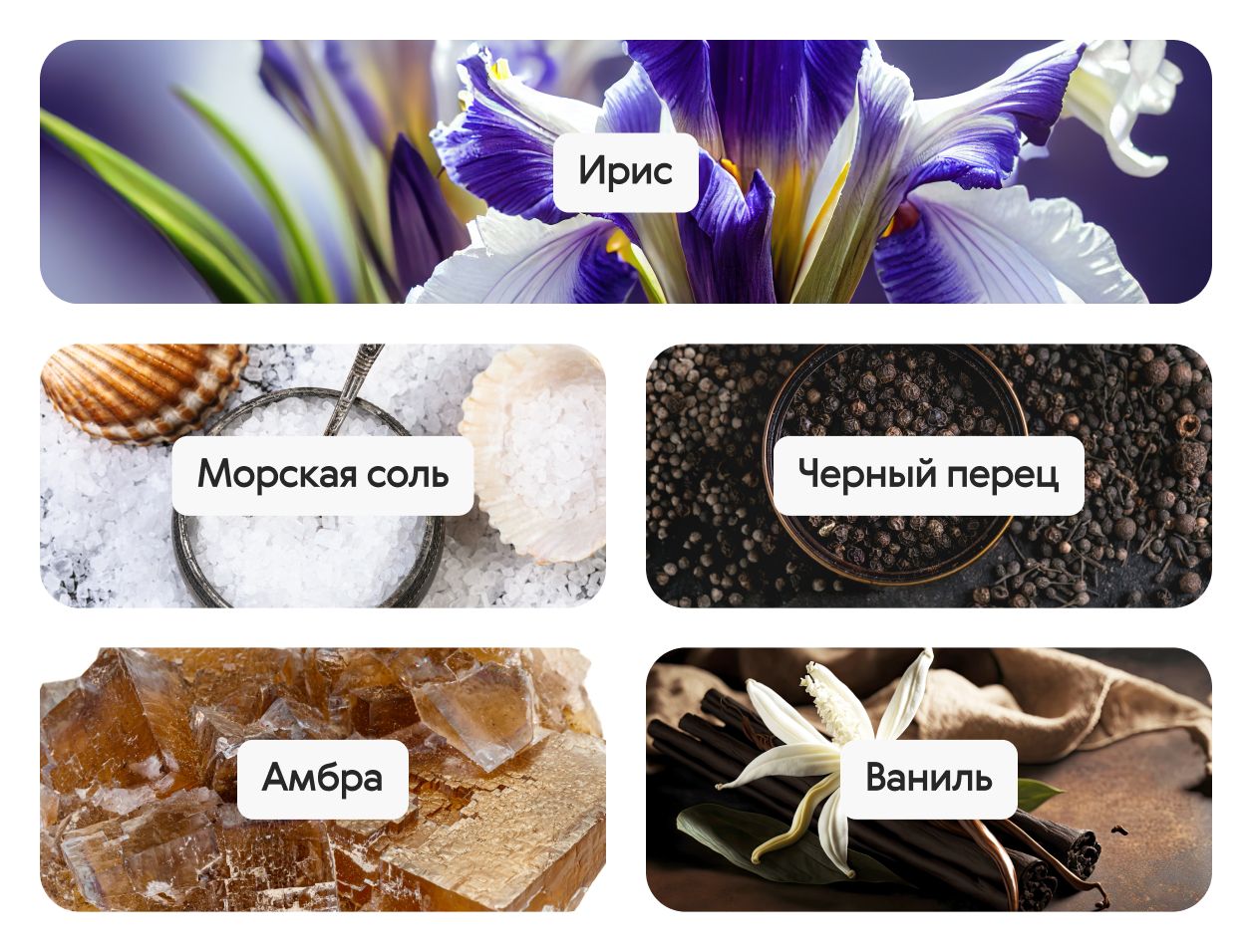 Ингредиенты (INCI): alcohol (79% vol.), parfum (fragrance), water (aqua), benzyl salicylate, linalool, hexyl cinnamal, amyl cinnamal, limonene, geraniol, coumarin, citronellol, citral, benzyl benzoate, benzyl alcohol, hydroxycitronellal, isoeugenol, alpha-isomethyl ionone, amylcinnamyl alcohol, cinnamyl alcohol.