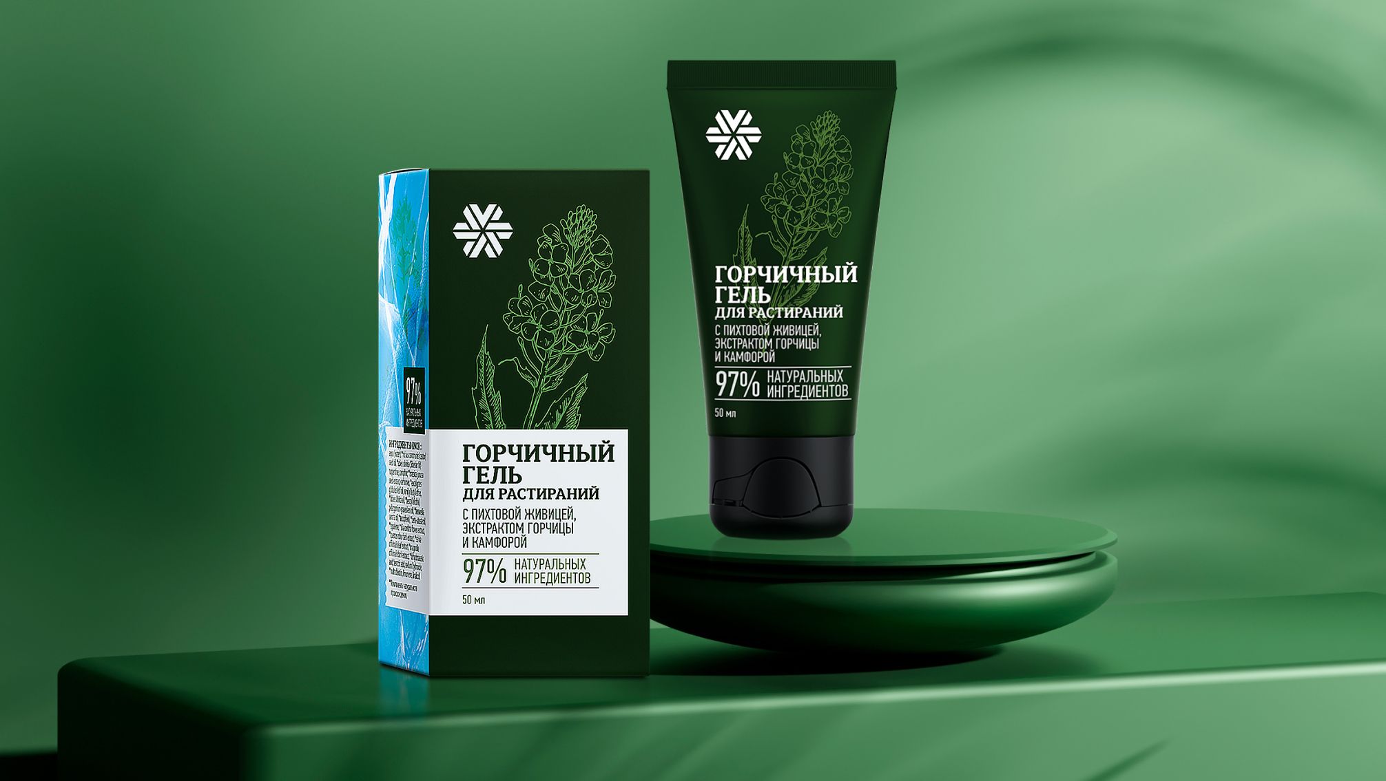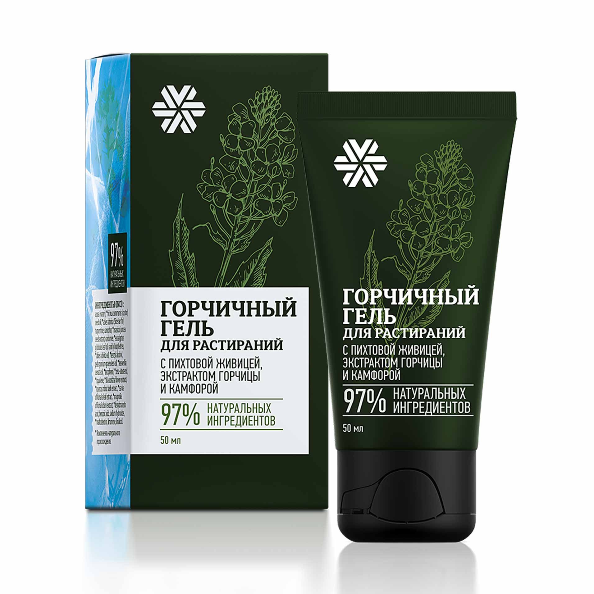 Ингредиенты (INCI): aqua (water)*, ricinus communis (castor) seed oil*, abies sibirica (Siberian fir) turpentine*, camphor, brassica juncea seed extract*, carbomer, eucalyptus globulus leaf oil*, vanillyl butyl ether, abies sibirica oil*, benzyl alcohol, pelargonium graveolens oil*, boswellia serrata oil*, tocopherol*, beta-sitosterol*, squalene*, soybean oil*, tilia cordata flower extract*, quercus robur bark extract*, salvia officinalis leaf extract*, magnolia officinalis bark extract*, dehydroacetic acid, benzoic acid, sodium hydroxide, maltodextrin*, limonene, linalool, geraniol, citronellol.