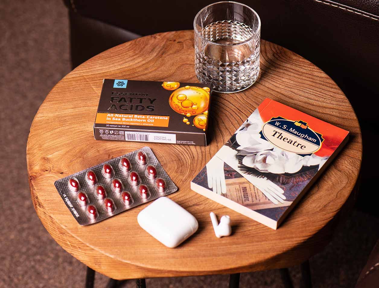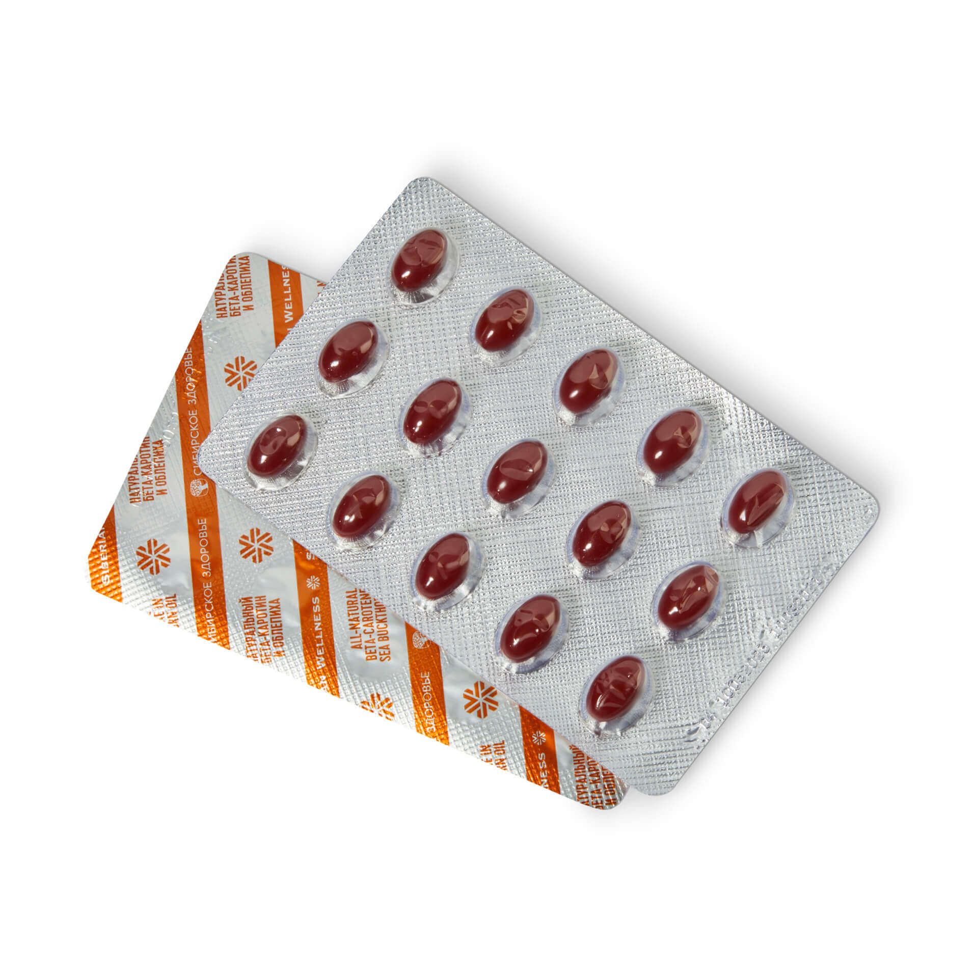 Облепиховое масло, смесь токоферолов (натуральный витамин Е), натуральный бета-каротин 30% CaroCare®. Оболочка капсулы из говяжьего желатина.