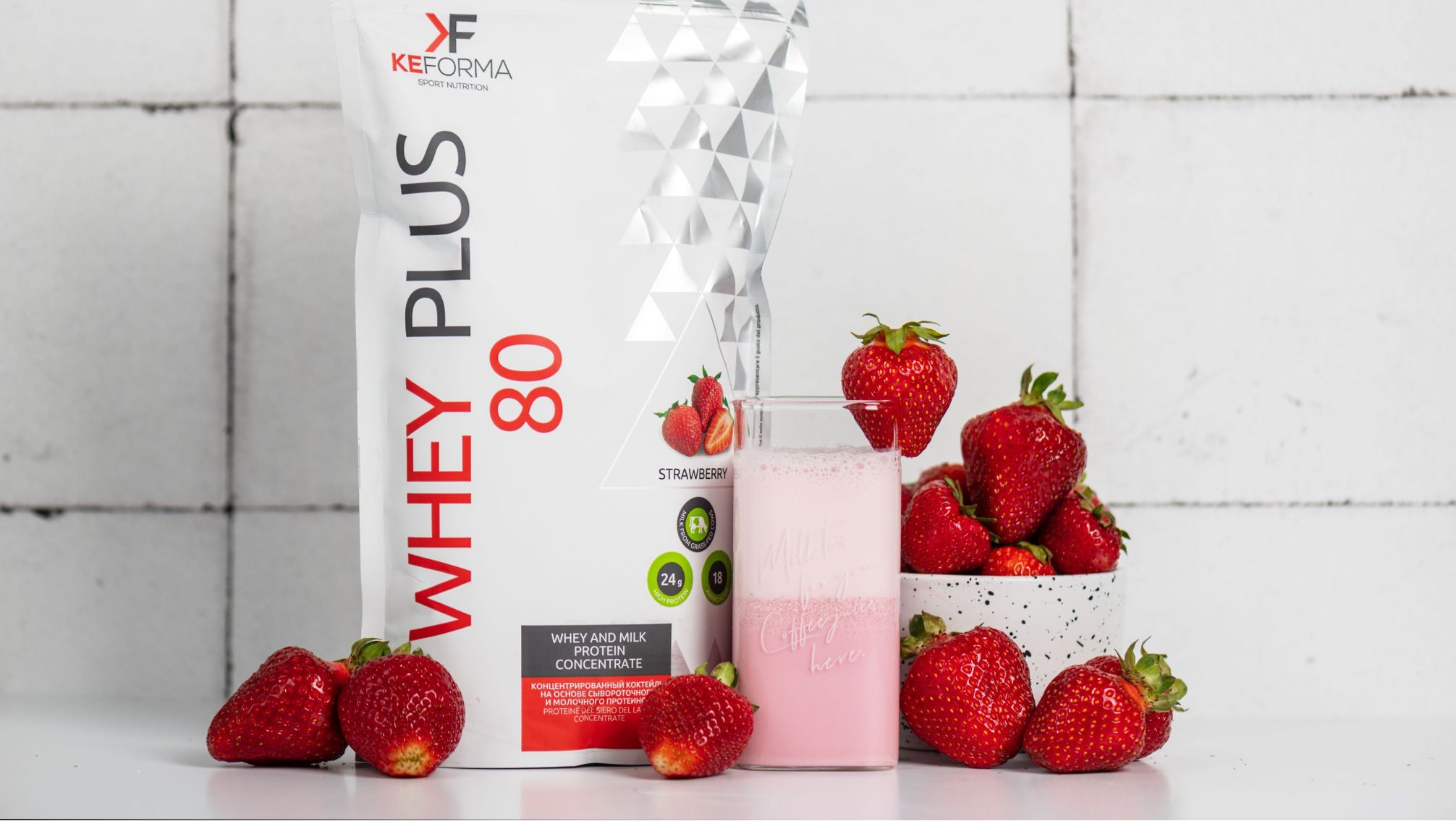 Концентрат сывороточного белка (содержит лактозу), концентрат молочного белка (содержит лактозу), мальтодекстрин, сублимированные кусочки клубники (2,6%), ароматизатор, загуститель: карбоксиметилцеллюлоза натриевая соль, антислеживатель: диоксид кремния, подсластители: сукралоза, ацесульфам калия, краситель: кармин.